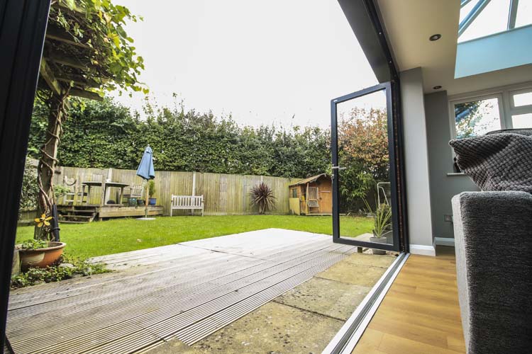 The roof lantern allows natural light to flood into the Orangery, while the aluminium bi-folding doors add another modern feature and feel to the room and offer views down the long garden. The aluminium bifold doors open onto a decking area so when fully open to allow a seamless transition to the garden.