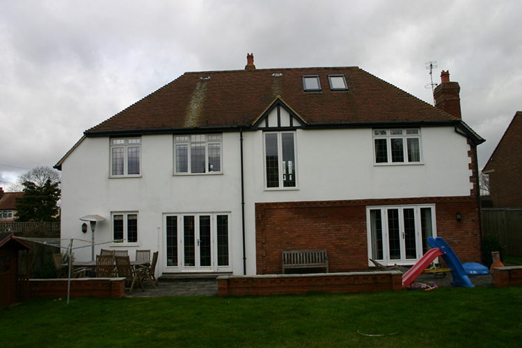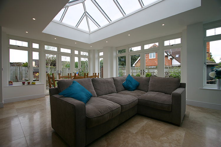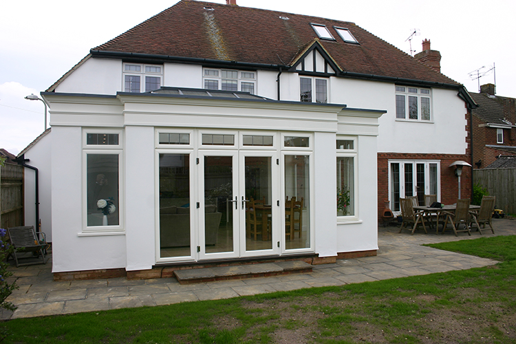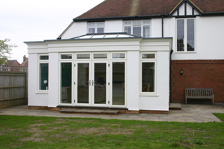 We designed a traditional Orangery with lantern roof. The Rustique satin white uPVC double glazed windows and doors feature a rectangle lead in a clerestory frame design, in keeping with the style of the property and the existing windows. The stepped front, timber fascia and decorative cornice, all add character and interest, and help to soften the blockwork and rendered elevations.