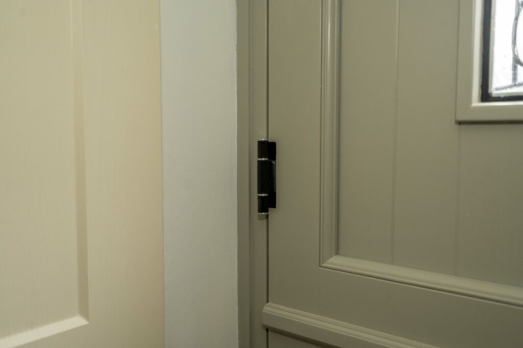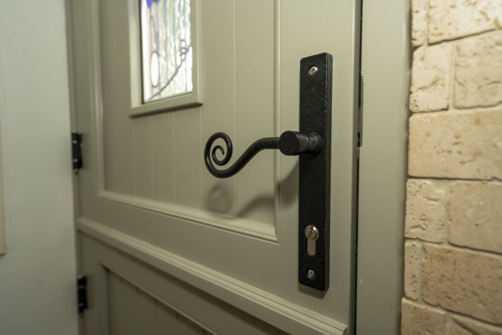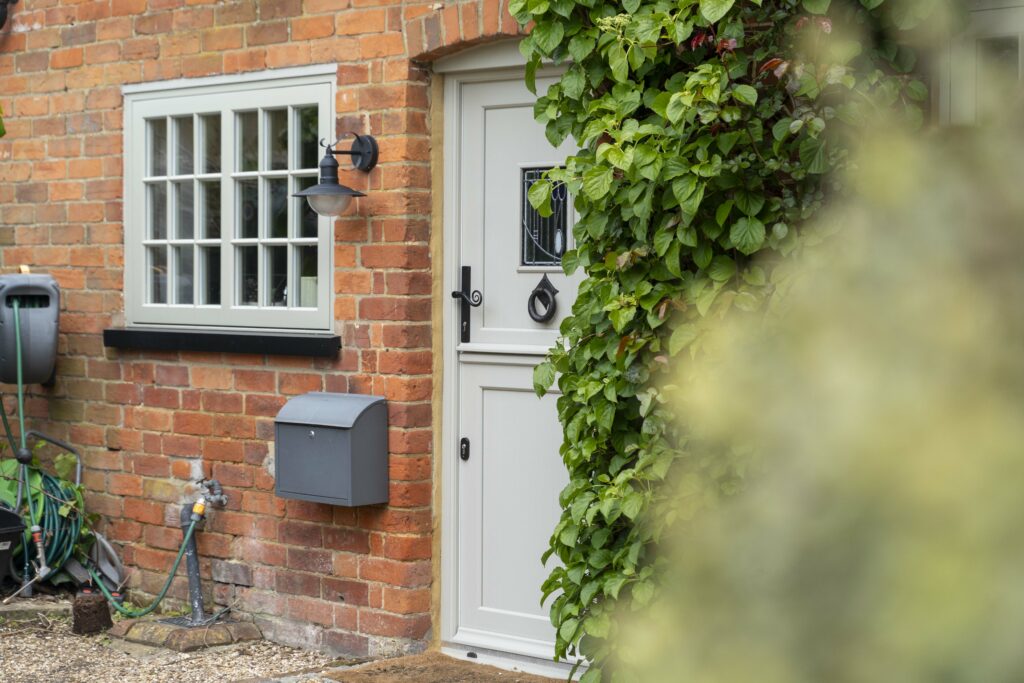 The homeowners selected black monkey tail slimline lever handles that complement the period and style of the timber stable door. This design feature, combined with the traditional shiplap panels and the elegant heritage pebble grey colour, harmonises well with the brickwork’s colour, enhancing the property’s overall visual appeal.