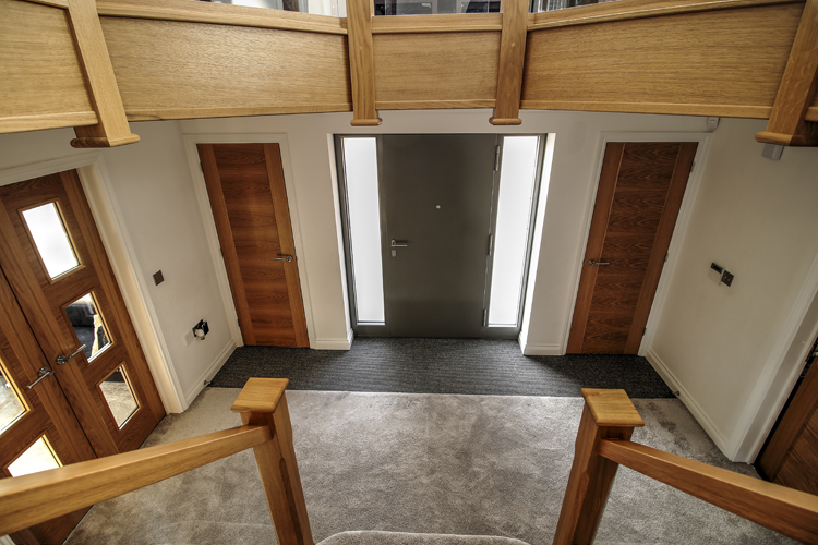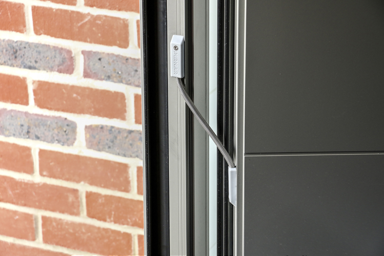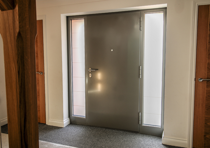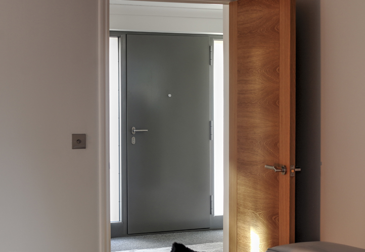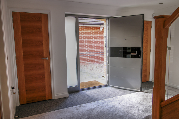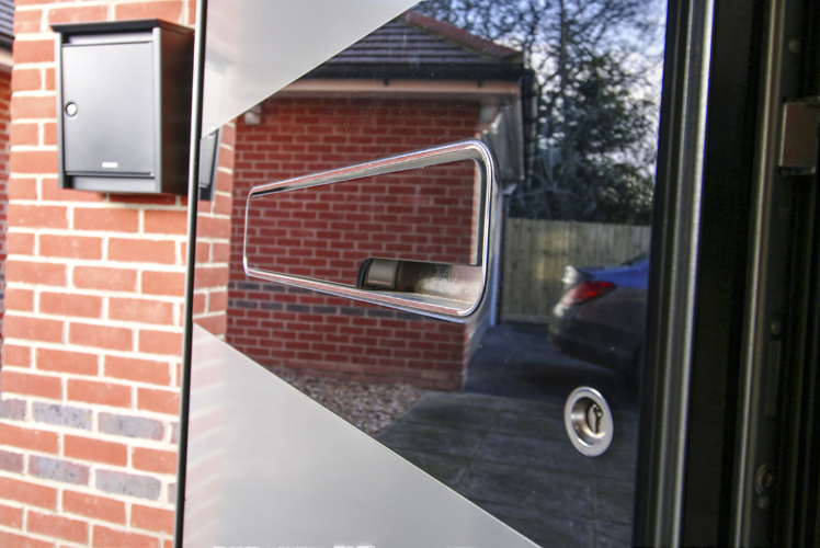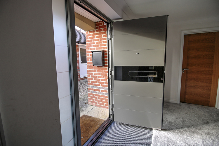 They chose a contemporary style Pirnar door from the Premiun range. The 6005 aluminium door is finished in RAL 9007 – Grey Aluminium. The handle features LED lights that illuminate on contact, and a finger scanner for the ultimate in high-tec security.