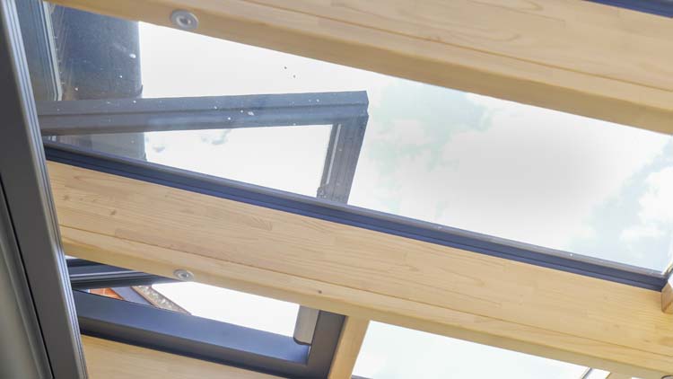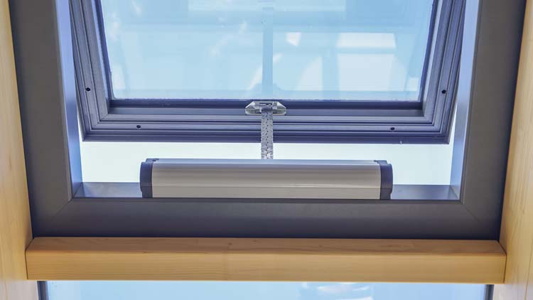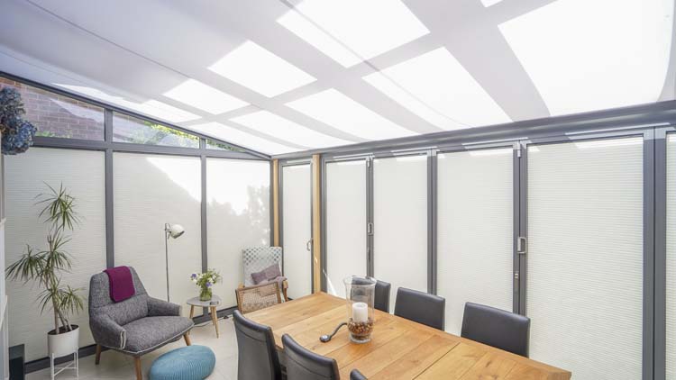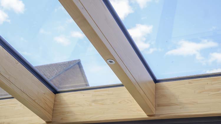 Two electric sliding roof vents allow for a high level of ventilation, and an internal motorised awning and integral blinds for all the bi-fold doors provide additional shading. Lighting extension rafter covers were used in the interior to allow for low voltage downlights to create a homely atmosphere in the evenings.