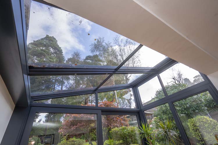 The roof glass panels are finished with a revolutionary low maintenance self-cleaning coating that reacts to the ultraviolet rays from the sun; it attracts rainwater to spread and forms a thin film that washes away quickly and dries off without leaving unattractive smearing and dirt.