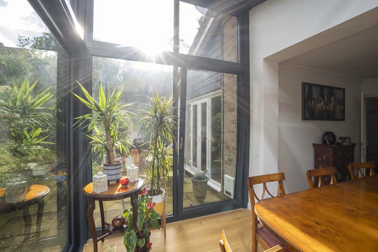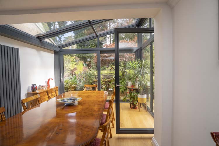 The slim sightlines of the floor to ceiling aluminium windows and doors frames ensure optimum natural light fills the living space and allows the Camberley homeowners to enjoy the views of the garden and benefit from a thermally insulated room all year round.