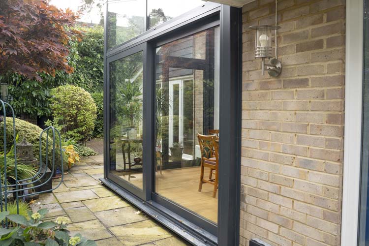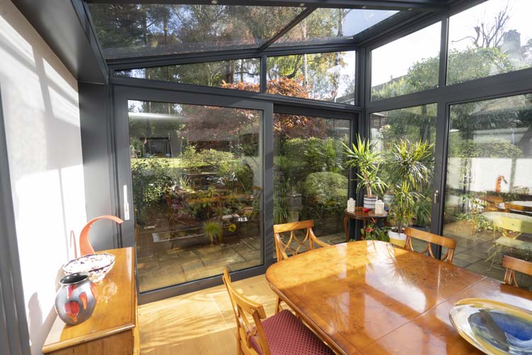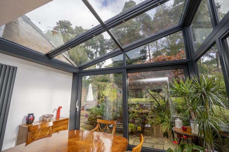 After discussions between a Solarlux designer, the owners and Thames Valley Windows, Marcus recommended a Solarlux Wintergarden with an SDL Akzent plus reverse pitch roof, SL 160 sliding doors, Ecoline fixed and tilt and turn aluminium windows. The thermally broken aluminium profiles are finished with a contemporary metallic tiger finish (WT029), a classic choice.
