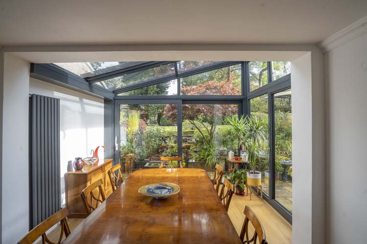 The homeowners were looking to replace their existing polycarbonate lean-to conservatory with a thermally efficient contemporary glass extension that they could use all year round.
