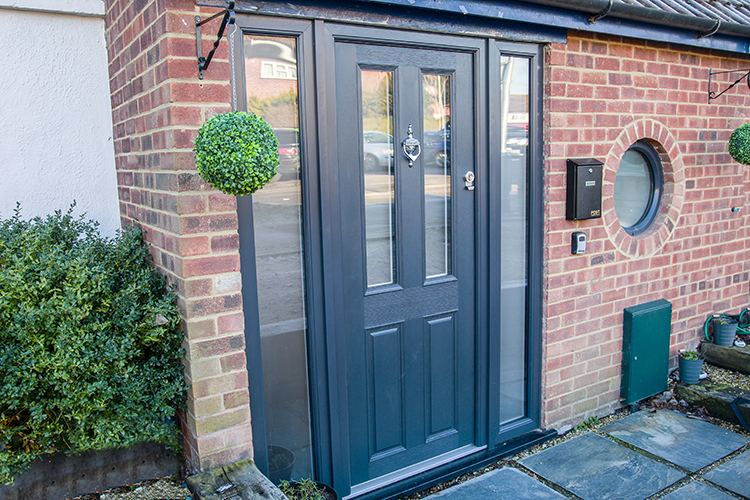 Our client in Arborfield Cross wanted to replace their front door with a new, composite door in a contemporary grey color. Together with our designer, an Apeer 70 composite door was chosen in the popular anthracite grey. The glass in the door panels and side windows is obscured for privacy and toughened triple glazed for security and thermal protection. The door furniture; knocker and thumb turn lock with finger pull, are all chrome silver.