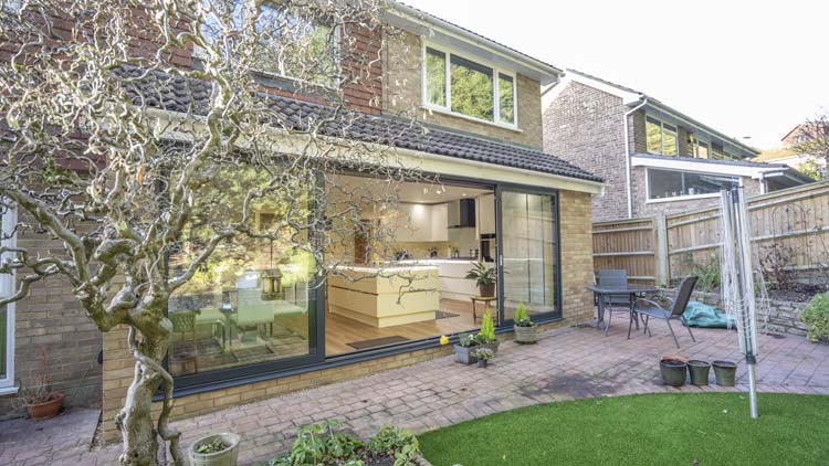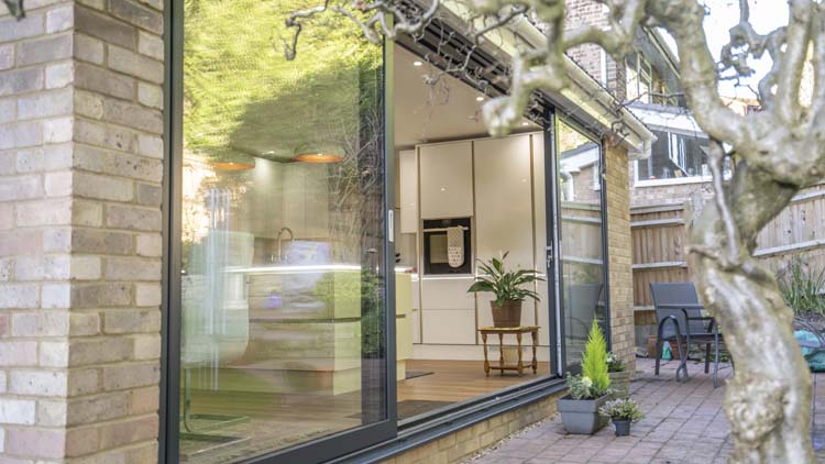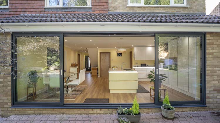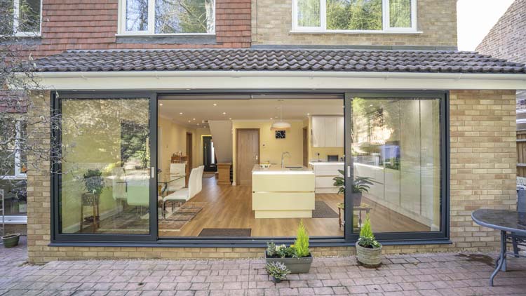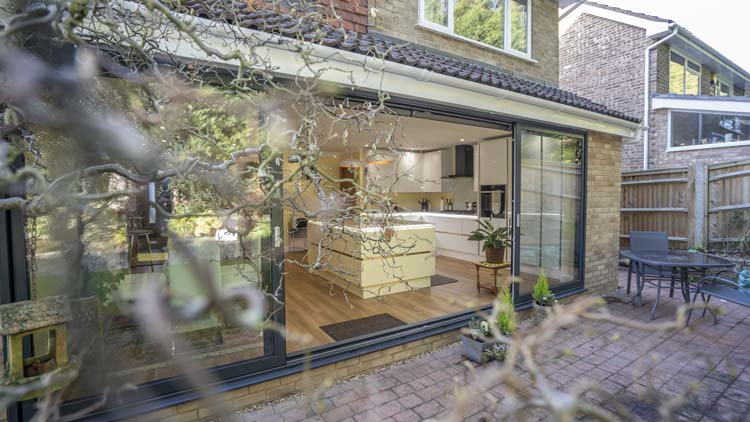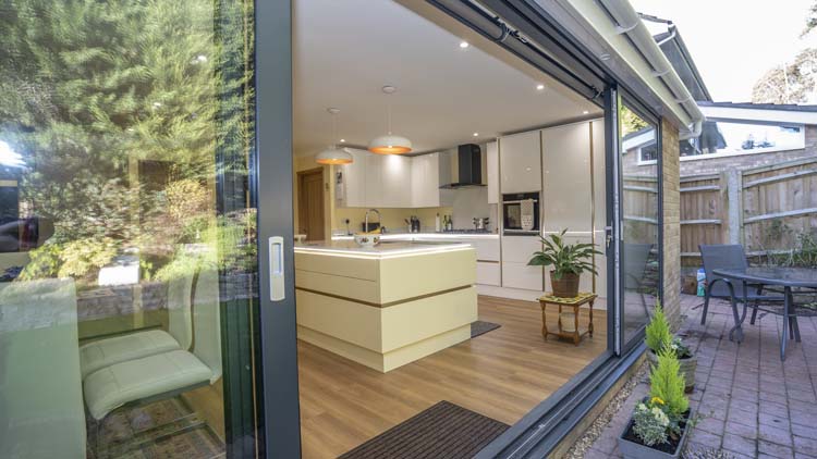 When a freshly built extension in Camberley with an aperture of 5748cm x 2175cm needed new energy-efficient bi-folding or sliding patio doors. The homeowners approached Thames Valley Windows for expert architectural glazing advice and design ideas. On seeing the architect plan, our design team instantly knew the perfect glazing solution. The large expanses of glass in the slim aluminium aïr lift and slide doors with integral blinds would be spectacular for the new kitchen extension transforming a light-filled open plan living area with views that change with the seasons.