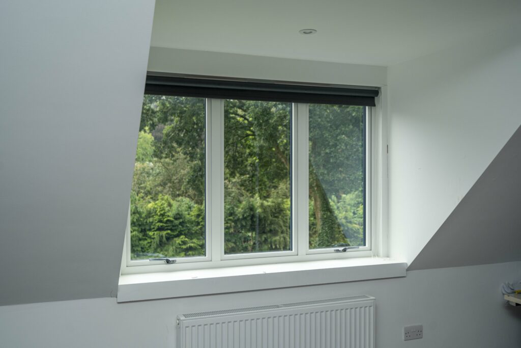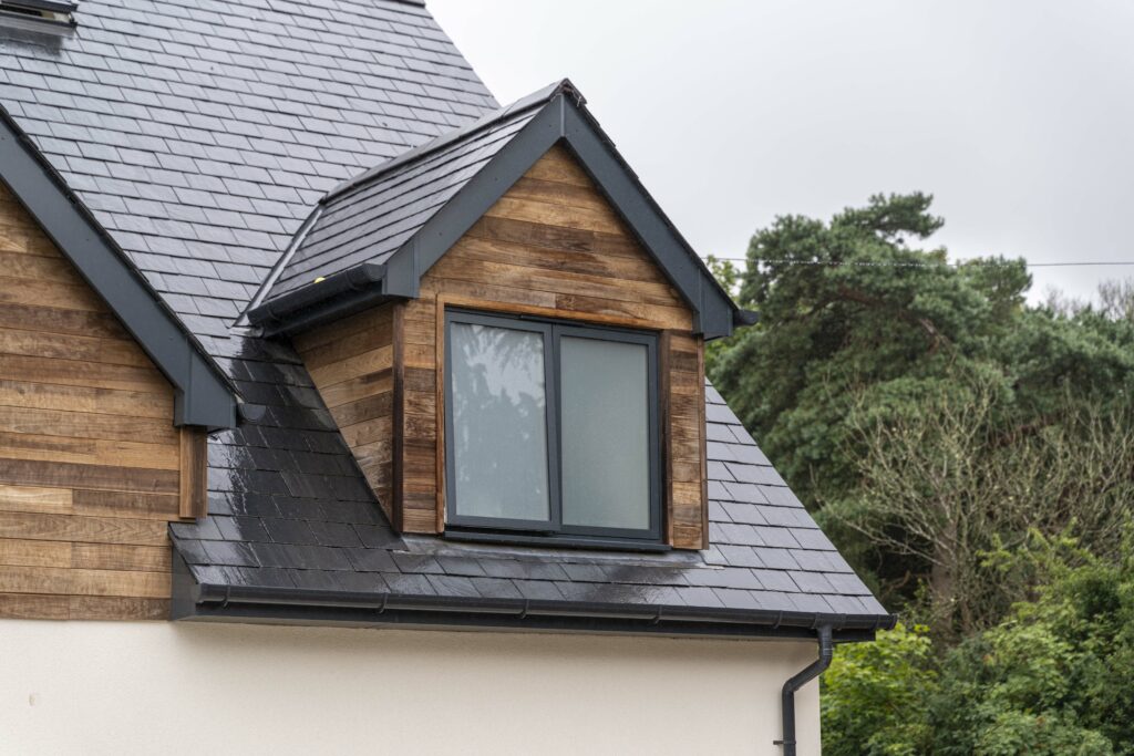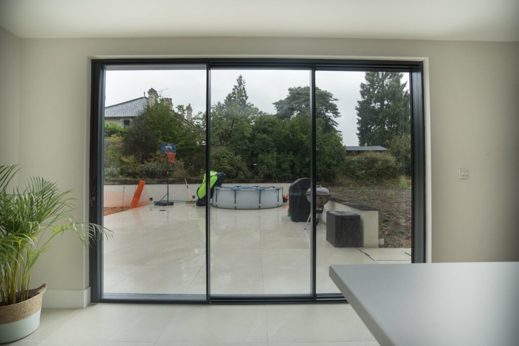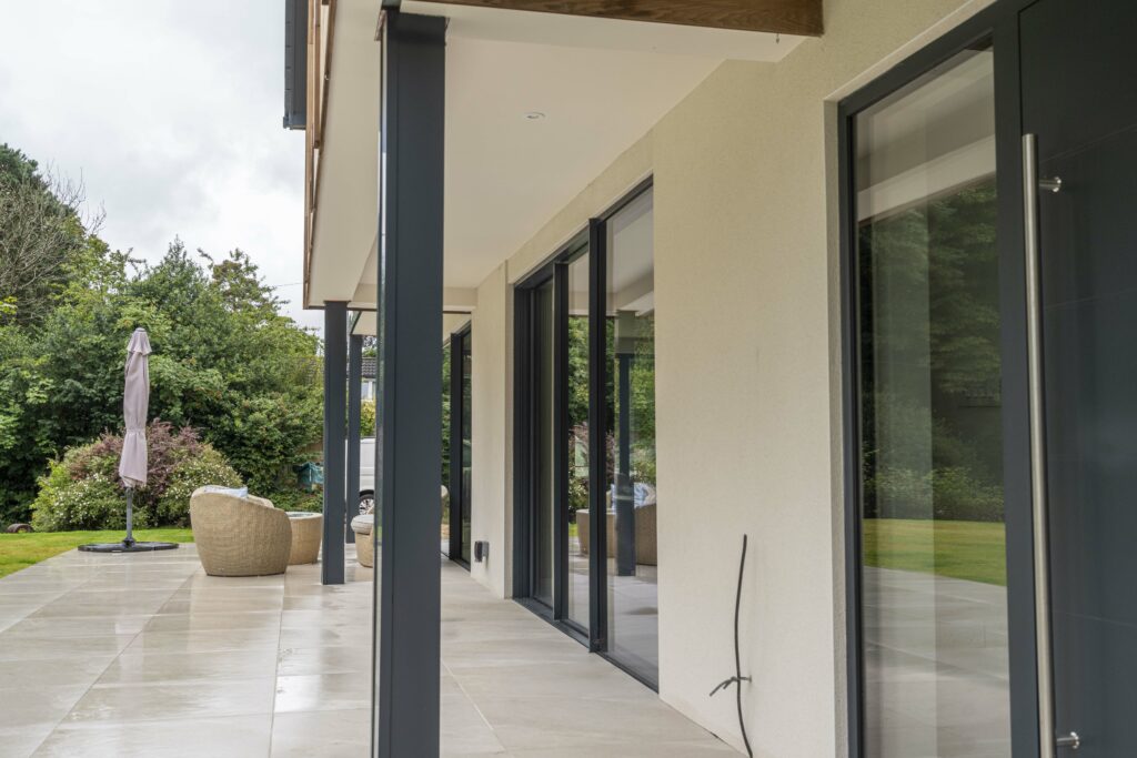 The existing exterior was a combination of bricks and white render. Part of the renovation plans was to re-render the lower walls with smooth limestone white render once the double-glazed windows had been installed. Liam worked with our surveyors’ purchasing and installation teams to ensure all the double-glazed grey aluminium windows and slimline sliding doors were designed, supplied and installed within the builder’s schedule.