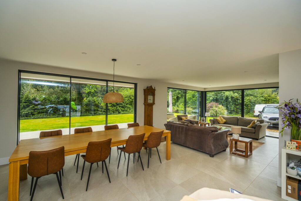 The architects had worked with our architectural project designer, Liam, on a previous new build project. The architect plans the homeowners sent to Liam featured large slimline grey aluminium windows and minimalist sliding doors to provide transparency and spatial continuity between inside and outside.