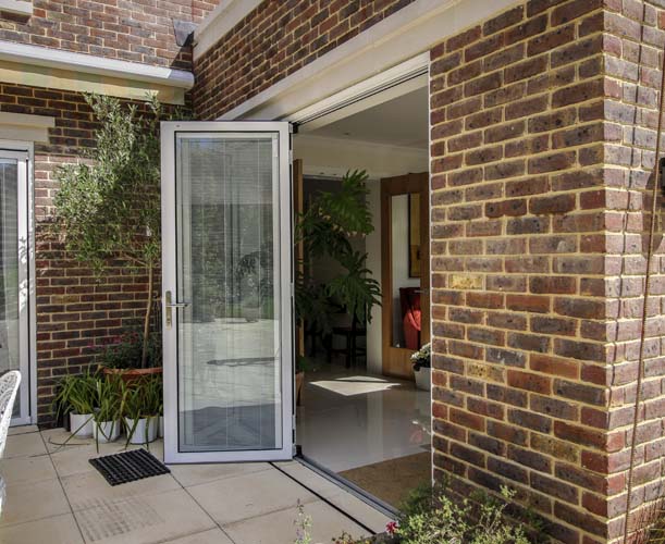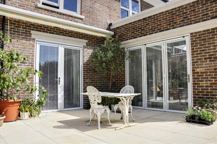The bi-fold doors are from Solarlux. They are aluminium and finished in Pure white, inside and out. We installed a 3-panel set in the living room and a 2-panel in the dining area, both of which lead onto the patio and garden. These Solarlux bi-fold doors in Esher are so easy to use and maintain and increase the property’s thermal efficiency.