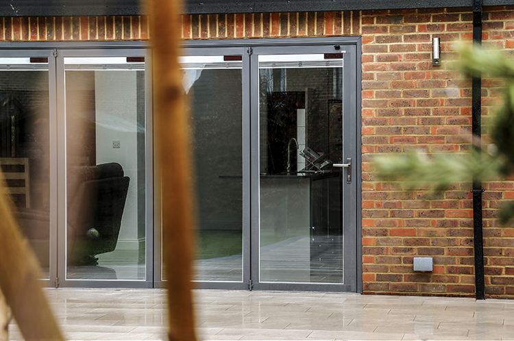 The aluminium frames are finished in a metallic Grey colour (DB703). Despite the expanse of glass, these bi-fold doors offer a low u-value of 1.4 W/m²K.
