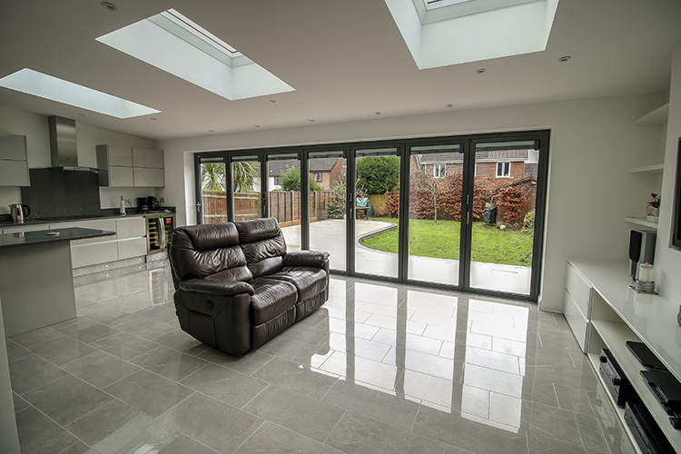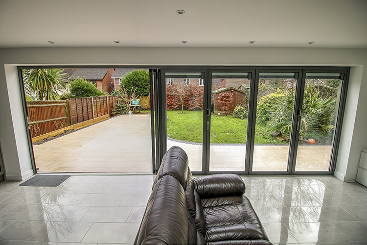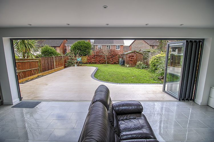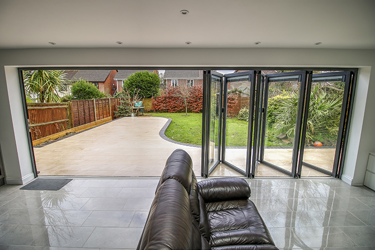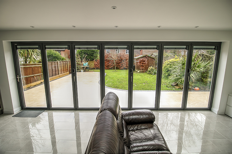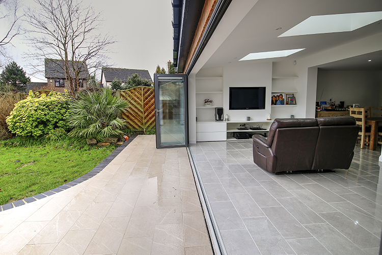 There are seven panels in total, including a traffic door, for quick and easy access in and out. When the bi-fold doors are fully open, the room and garden are almost as one. A flush track creates that seamless feel between the inside and outside.