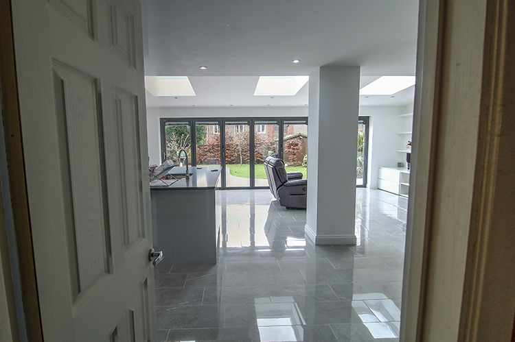 This traditional-style family home with rosewood windows and mock-tudor style beams has been extended to provide a large, modern, open plan kitchen, dining and living area. The bright, light-filled space features high gloss floor tiles, rooflights and bi-fold doors which span the full width of the room.