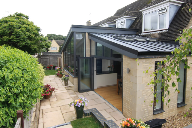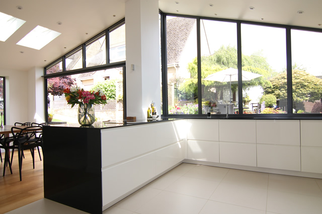 With their barrier-free flush floor track, the bi-folding doors seamlessly integrate with the newly created split level patio area and garden, which wraps around the new extension. The fixed and shaped window frames add to the imposing style and allow even more natural light into the space. Additional roof lights in the mono pitch roof, a statement kitchen and gloss floor tiles add to the sense of space and light in the extension.