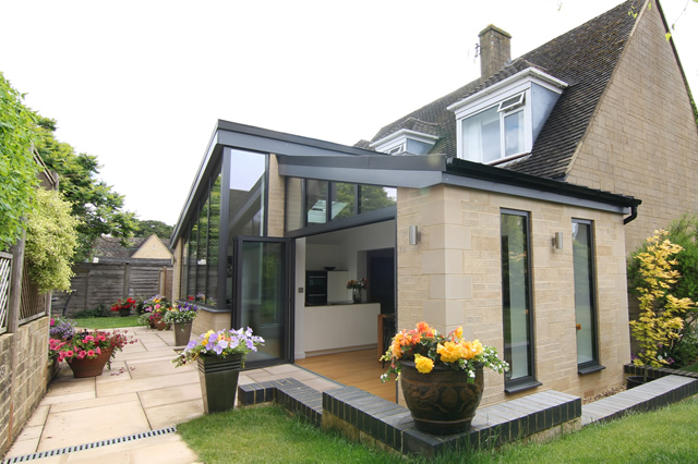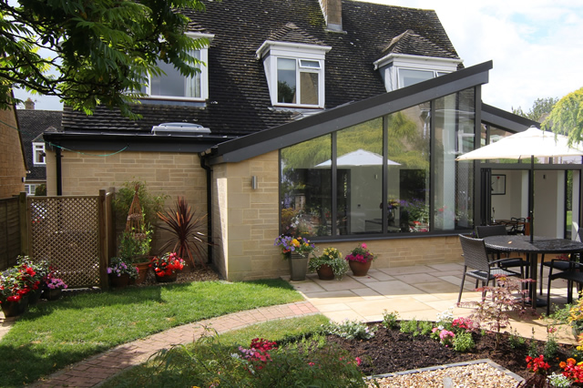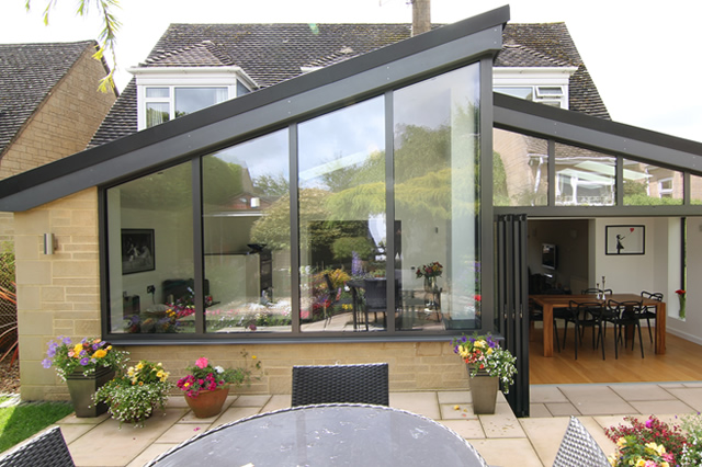 A combination of Solarlux SL60e bi-folding doors in Oxford and SL60e fixed and shaped frames have been used to complete a striking gable roofed extension on a 1960s chalet style house.
