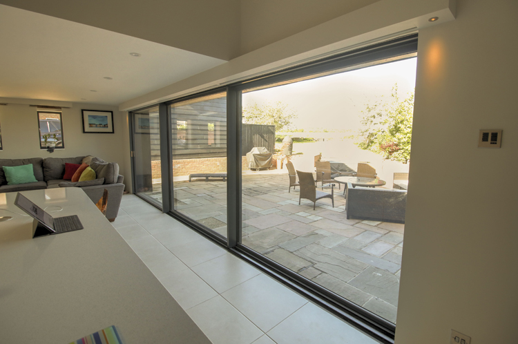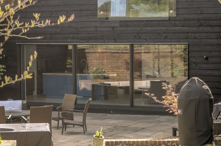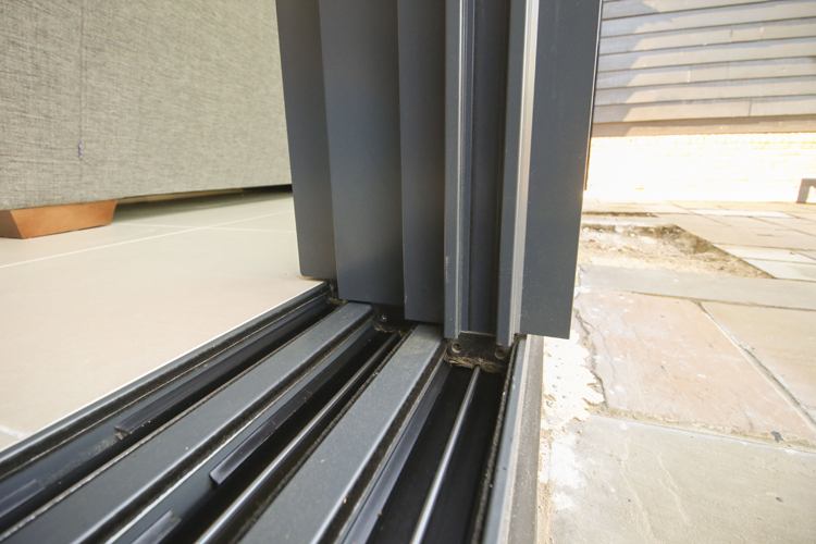 The sliding doors at the back of the property are from Solarlux. The Solarlux Cero Sliding Doors in Winchfield have a slim 34mm aluminium profile. The frames are concealed in to the floor, walls and ceiling. The 3 panes span 6,400mm and weigh in excess of 160kg. Despite their size, these doors glide effortlessly along the triple track.