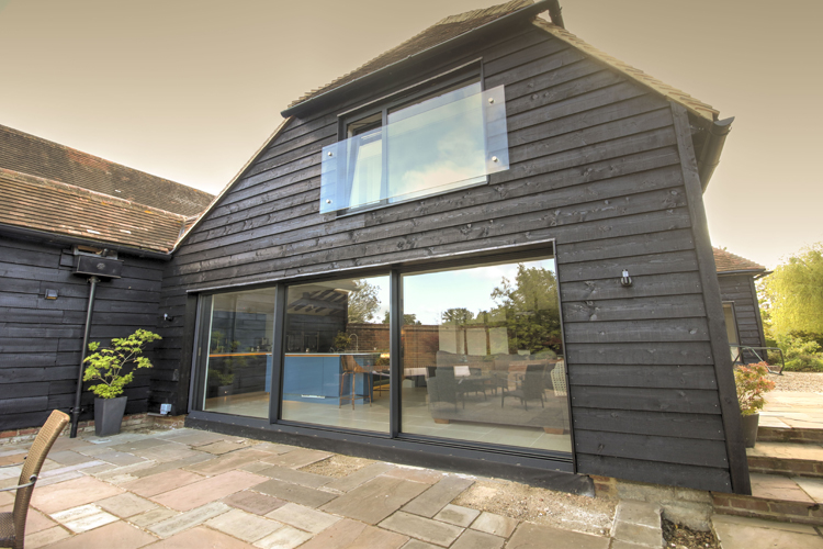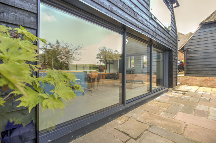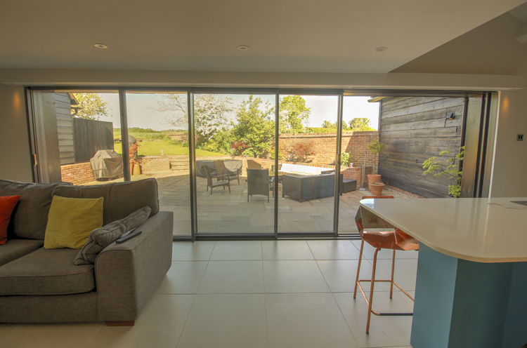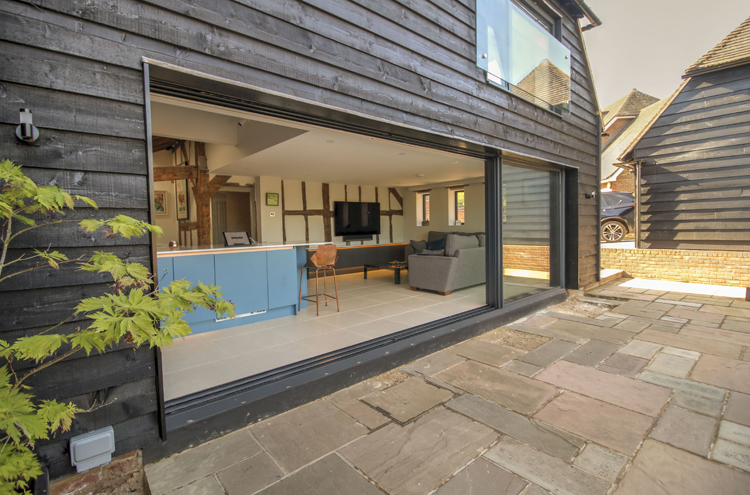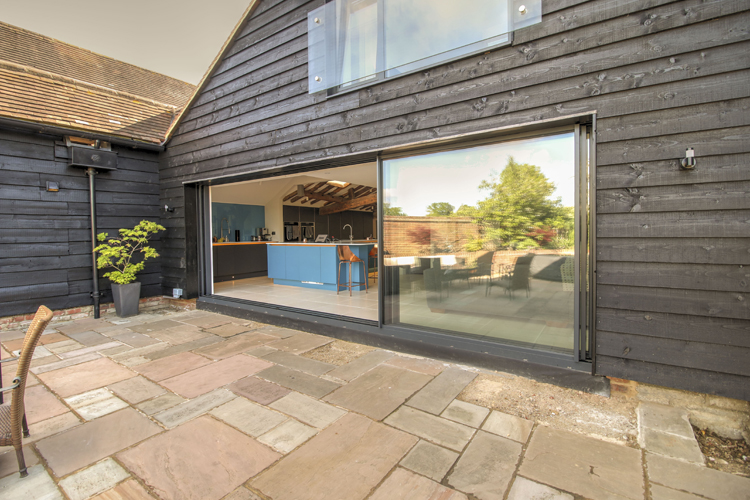 This 16th-century barn has been converted into a light-filled home using Solarlux Cero Sliding Doors in Winchfield. It’s had various owners over the years, and in the 1980s, it was the local pub. The building is listed, which meant a few hoops had to be jumped through, but the effort has been worth it.