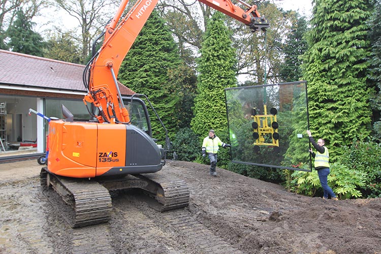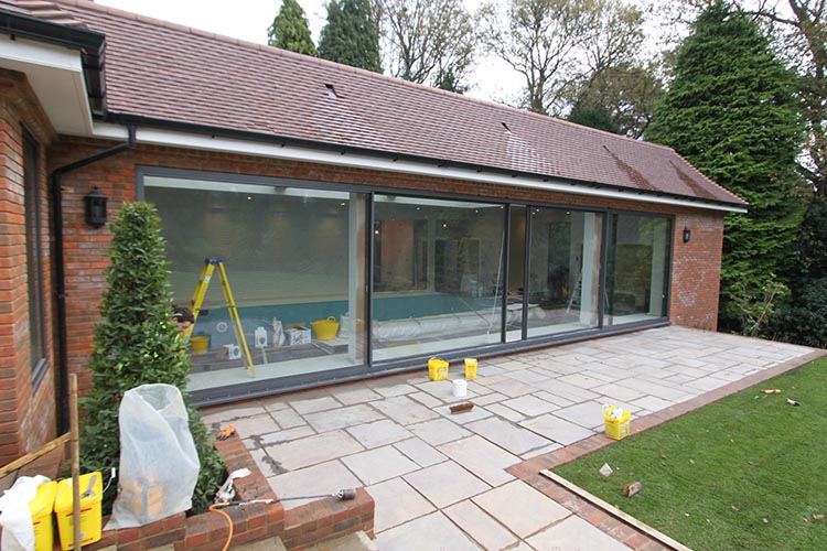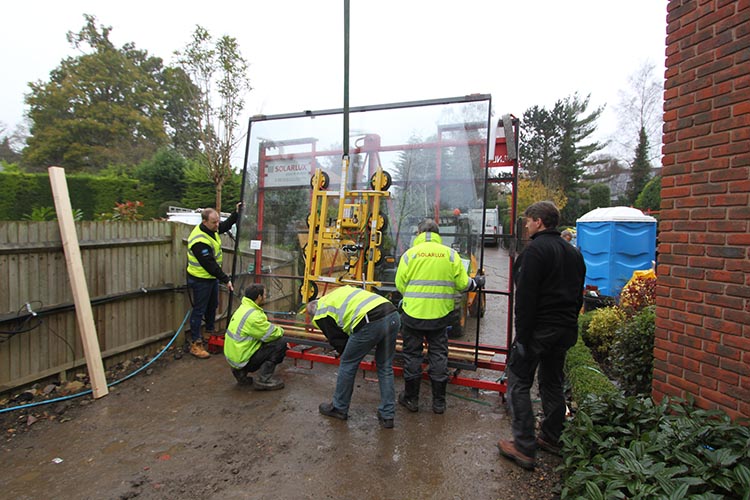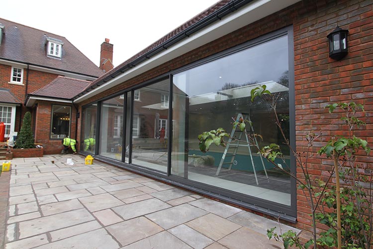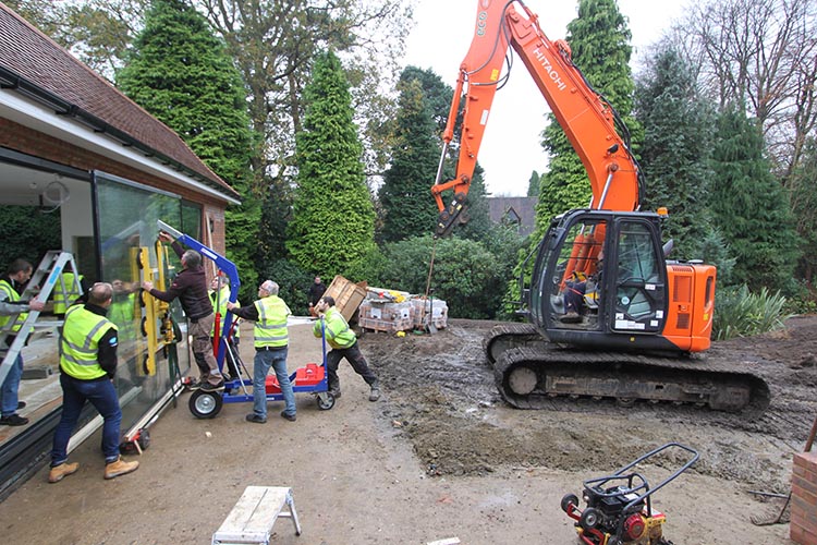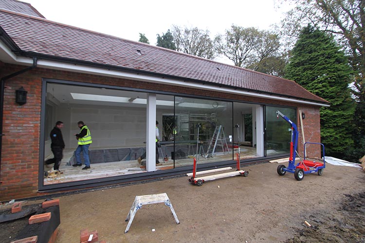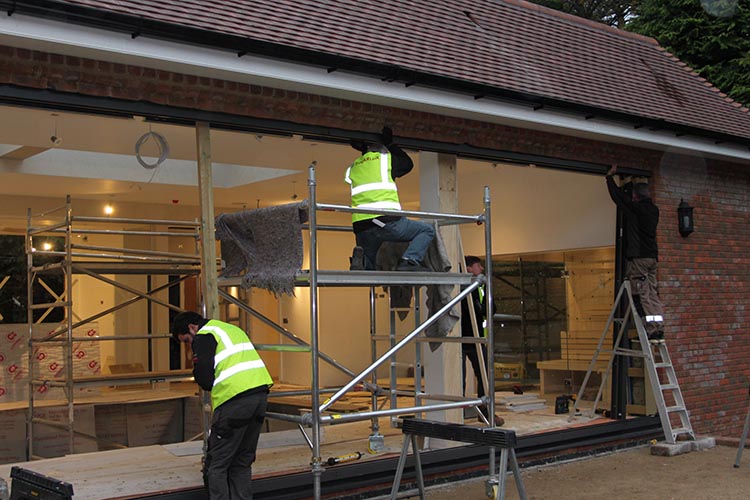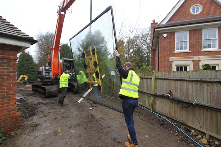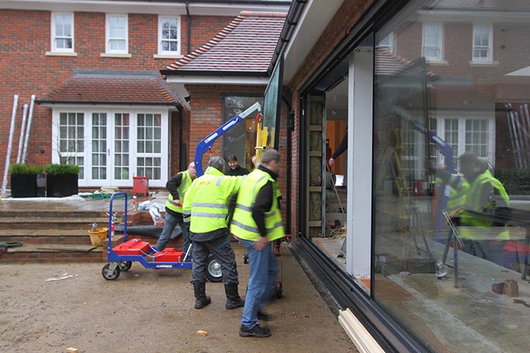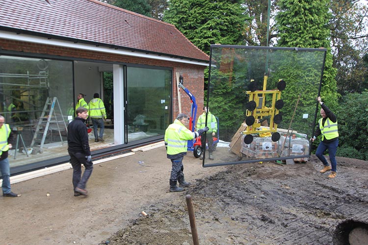 The project was an extension to add a pool area and gym to an existing new build property by one of the most prestigious developers in the South of England. The minimal frame and achievable panel weights meant that the vast opening could be done in just 4 panels. Spanning a total width of over 12000mm and 3000mm in height, the panel sizes were in excess of 9m² and weighed approximately 360kg each. As you can see from the images this is quite an undertaking and the logistics have to be carefully organised and managed to ensure the doors arrive and are installed in optimum condition. Despite the extreme weights involved, the doors move effortlessly and we can achieve sizes up to 15m² and 1000kg in weight.