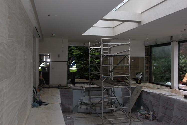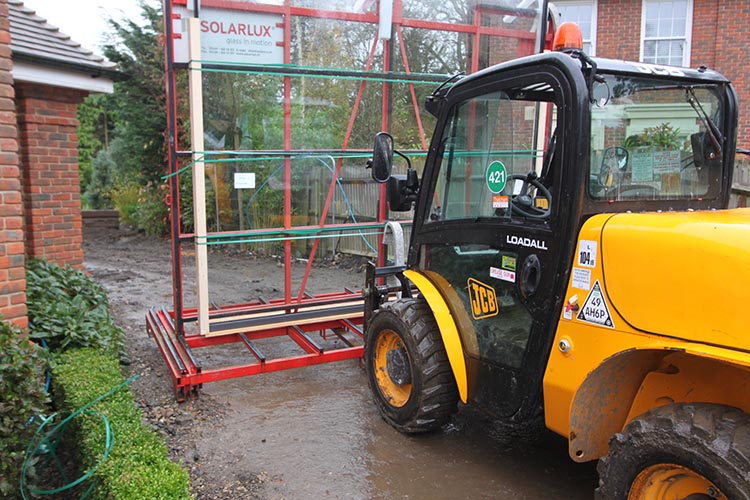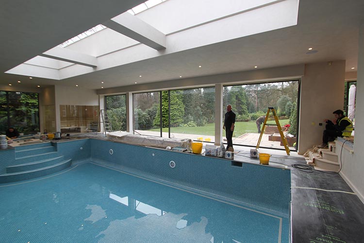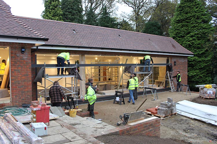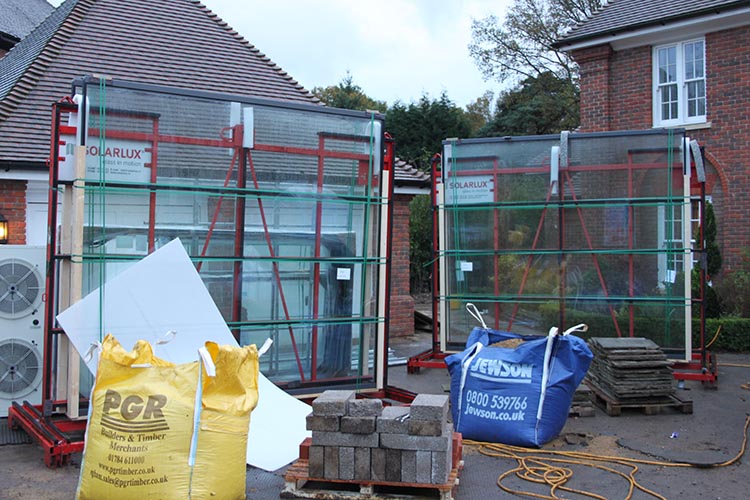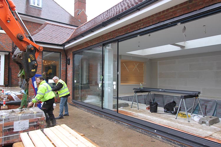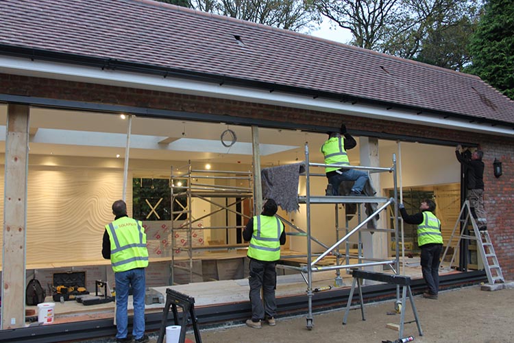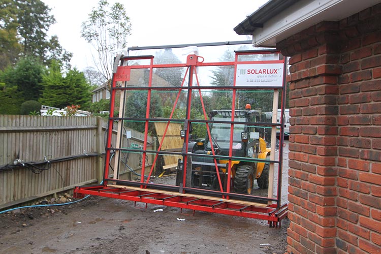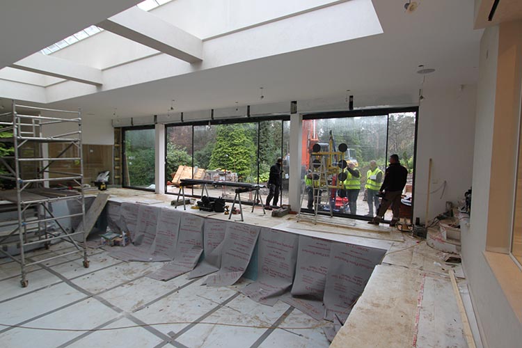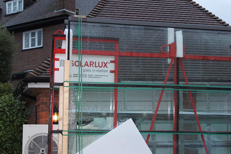 The project was an extension to add a pool area and gym to an existing new build property by one of the most prestigious developers in the South of England. The minimal frame and achievable panel weights meant that the vast opening could be done in just 4 panels. Spanning a total width of over 12000mm and 3000mm in height, the panel sizes were in excess of 9m² and weighed approximately 360kg each. As you can see from the images this is quite an undertaking and the logistics have to be carefully organised and managed to ensure the doors arrive and are installed in optimum condition. Despite the extreme weights involved, the doors move effortlessly and we can achieve sizes up to 15m² and 1000kg in weight.