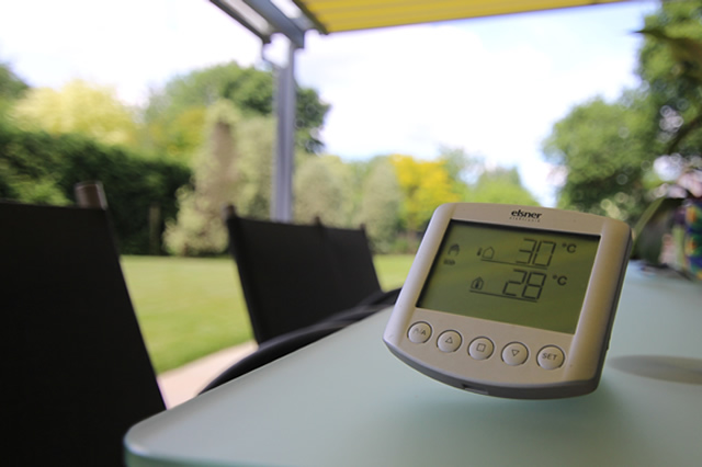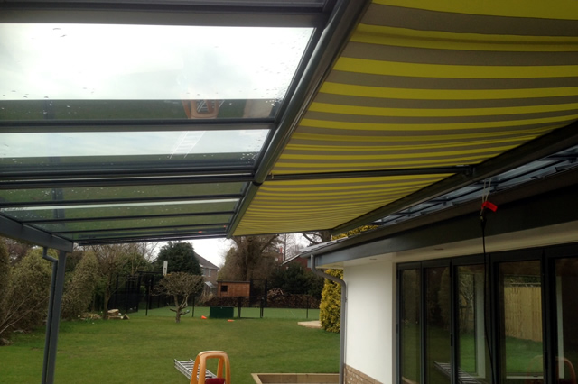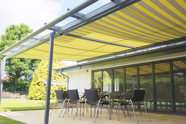 The motorised Markilux Awning sits beneath the roof to provide shade when needed.
