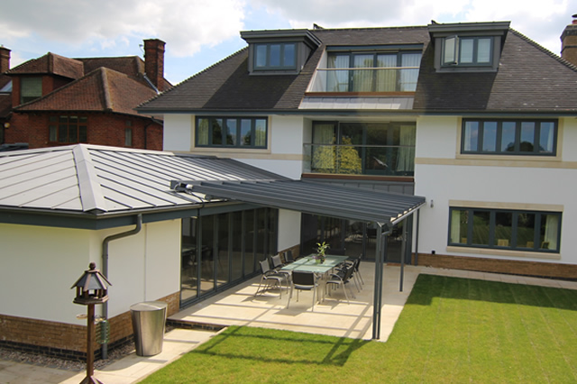 We installed a stunning Solarlux contemporary aluminium and glass canopy. We had to overcome a number of issues including sitting the canopy on top of the existing zinc roof with a timber beam and steel bracket detail but the finished project is magnificent.