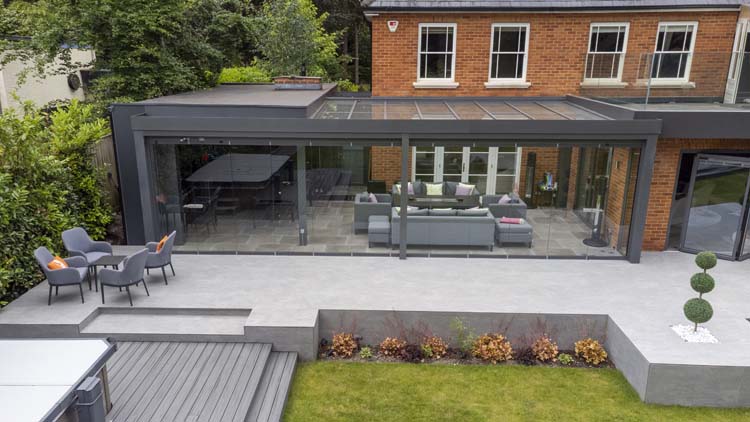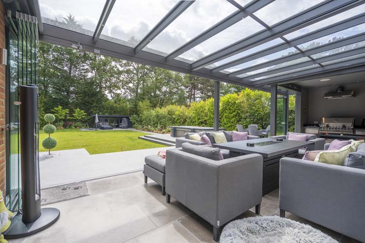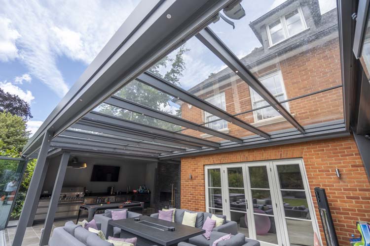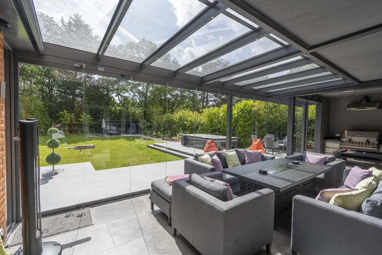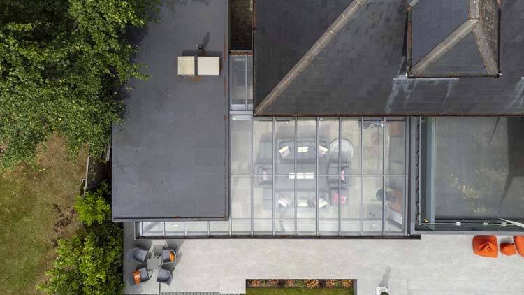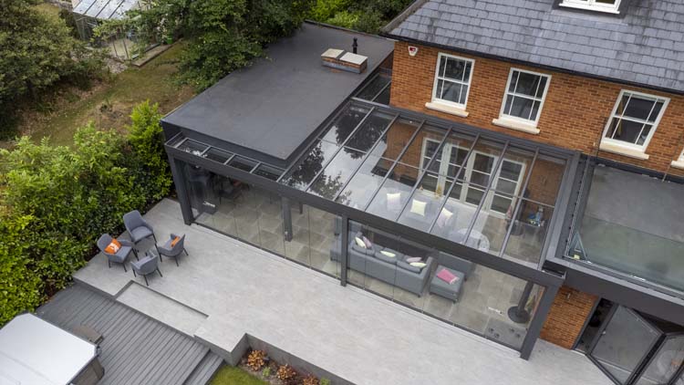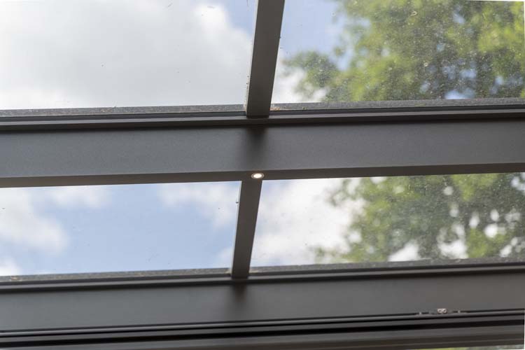The slim profiles of the glass roof aluminium frames not only improve natural illumination but also frame views of the sky.