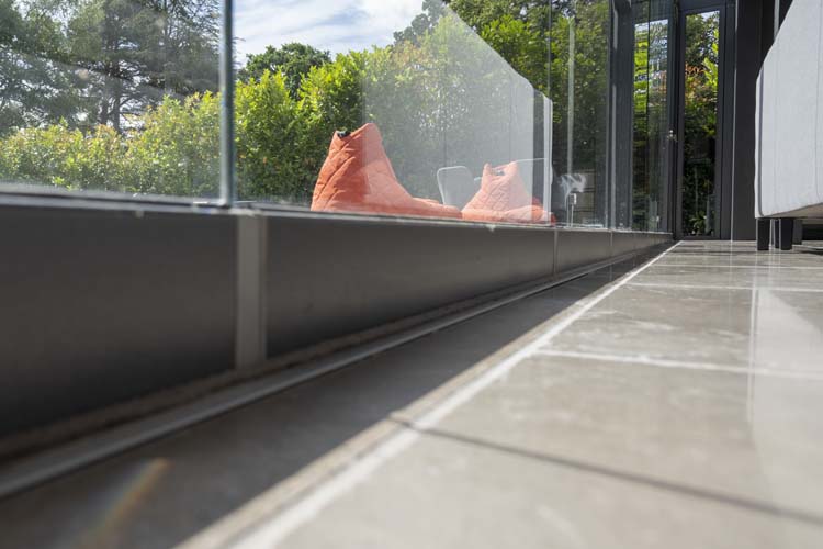 The 12 sliding panels, measuring 2,550 mm in height and 2,000 mm in width, have a flush floor track and feature a leading door at each end. Whether open or closed, the offer uninterupted views whilst blurring the lines between the interior and the surrounding landscape.