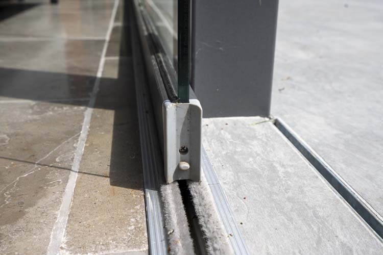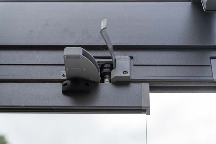 The glass door panels are secured in line within aluminium profiles at both the top and bottom. The panels are suspended from the top horizontal profiles and guided along the bottom horizontal profiles using the running mechanisms. Designed with a safeguard in the second panel to stop incorrect operation.