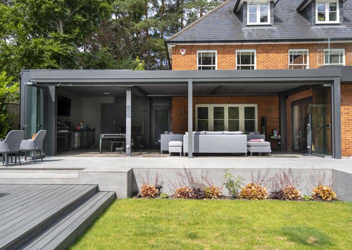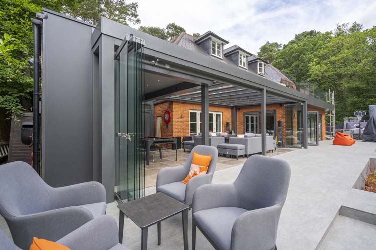 Located in the tranquil surroundings of Sandhurst, this impressive contemporary Solarlux SDL Acubis glass room extension, designed by PS Architectural, redefines the seamless connection between indoor and outdoor spaces with a stunning outdoor kitchen/dining area where the homeowners can enjoy al fresco dining and entertaining with family and friends.