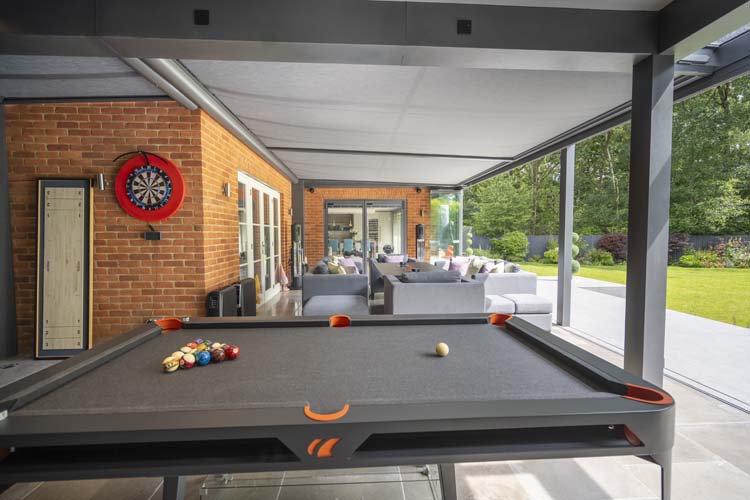 The motorised internal and external awning provides solar protection. Internal LED spotlights have been installed in the roof beams to illuminate the extension at night.