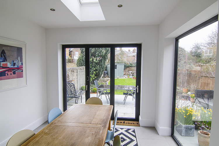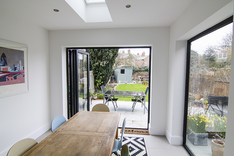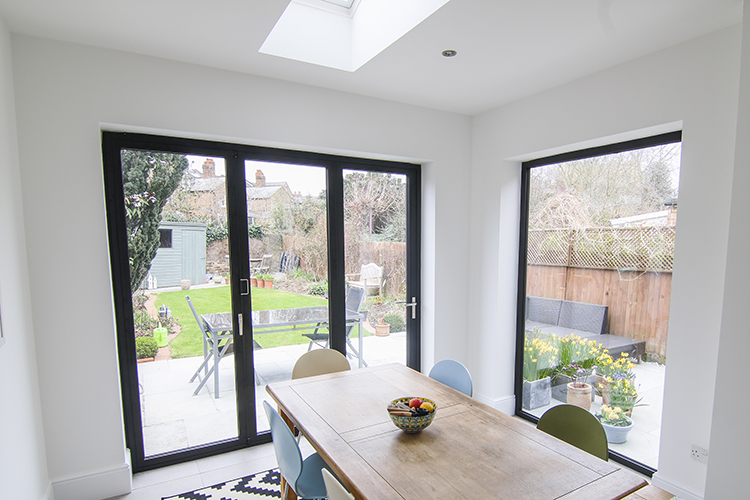 This Victorian property in Windsor had been extended some years ago. The new owners wanted to modernise the space by relocating the kitchen and creating new openings for a more modern, open plan look. Thames Valley Windows installed a set of two-panel Solarlux SL 60e Bi-Folding Doors in the sitting area plus a large fixed frame window, and a 3-panel set of SL 60e bi-folds in the breakfast area. A rebated threshold offers the best protection from the elements as it is weather-tight and helps to connect the inside and outside space. The frames were finished in a bespoke colour that are a smart contrast against the traditional brick.