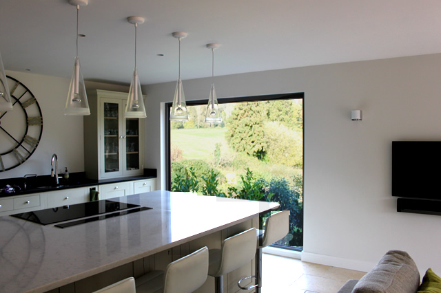 We recommended the bespoke Solarlux SL60e Bi-Folding Doors. Both a 3 and 4 panel door set were combined to create an open corner effect to the room. In addition to the large Solarlux SL 60e fixed frame window on that elevation, our client has been able to take advantage of a stunning back drop to the house bringing in the masses of light and an appreciation of the garden and beyond.