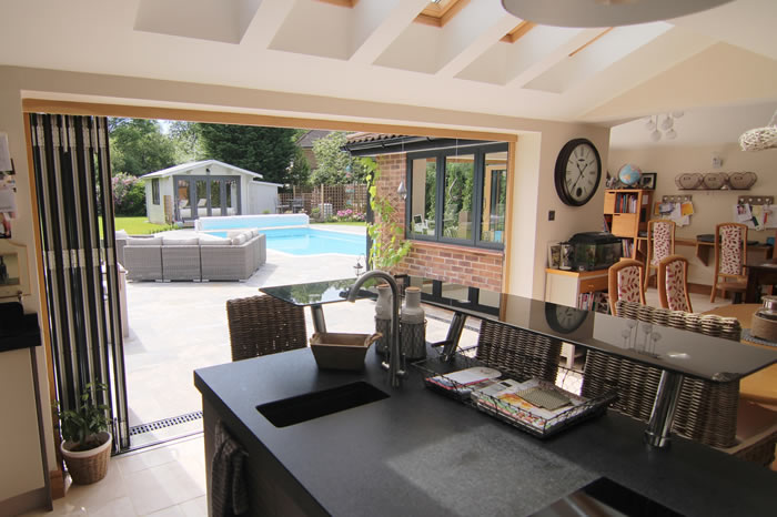 Our client took on the ambitious project to extend to the rear of their property and create a spacious open plan kitchen and living area, which would provide easy access to their beautiful rear garden and outdoor swimming pool.