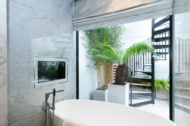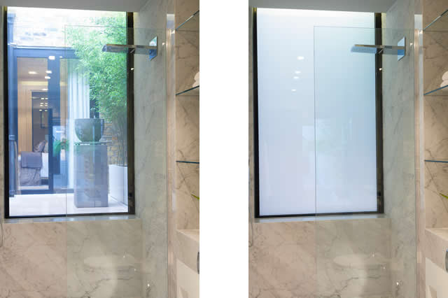 The pictures also demonstrate switchable crystal privacy glass to the en-suite area enabling the client to electronically choose between clear and opaque glass at the flick of a switch.
