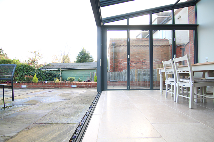 A rebated threshold was used on the Solarlux SL81 Bi-Folding Doors to allow for a fully weathered system with high performance weather rating. The external patio level was raised to the base of the threshold so provide a minimal step from inside to out.