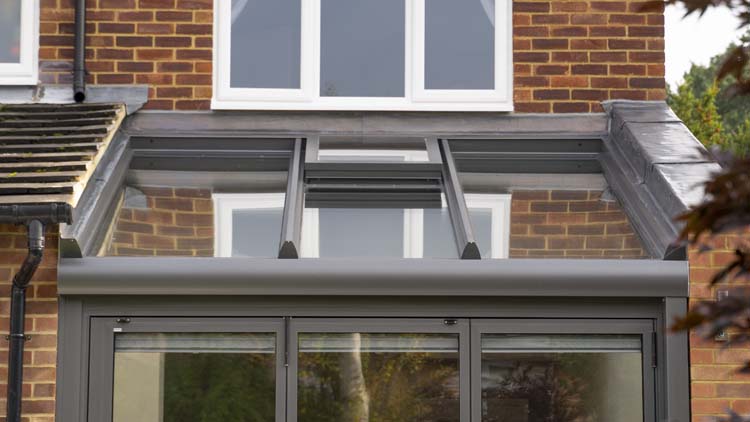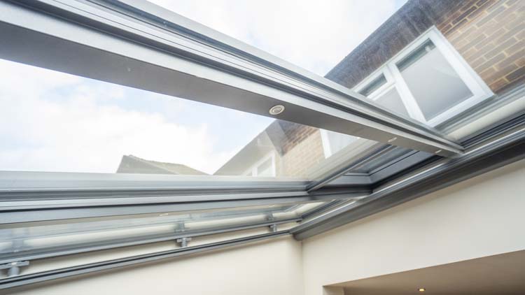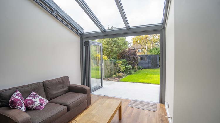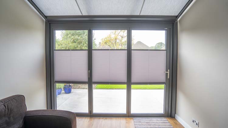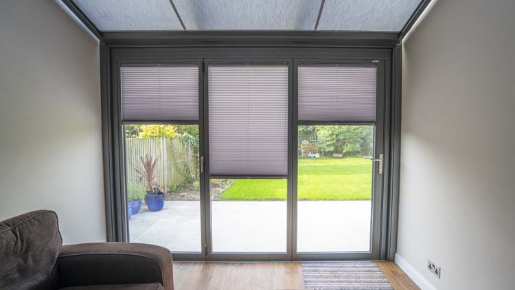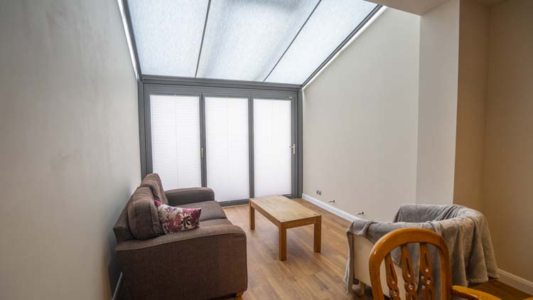 Although all of the glazing in the glass box extension is solar heat reflective, the homeowners wanted to ensure that the Wintergarden did not get too hot in the summer they opted for an internal shading system. They chose a motorised awning for the triple glazed glass roof and pleated blinds for the bifold doors to protect the room from the summer glare and high temperatures.