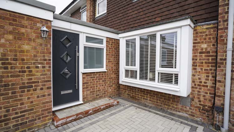 Alongside the clean and sleek looking square bay window in the lounge, we also installed white uPVC double glazed French doors to the rear of the Bracknell property and a secure and thermally insulated anthracite grey composite door from the Apeer contemporary range.