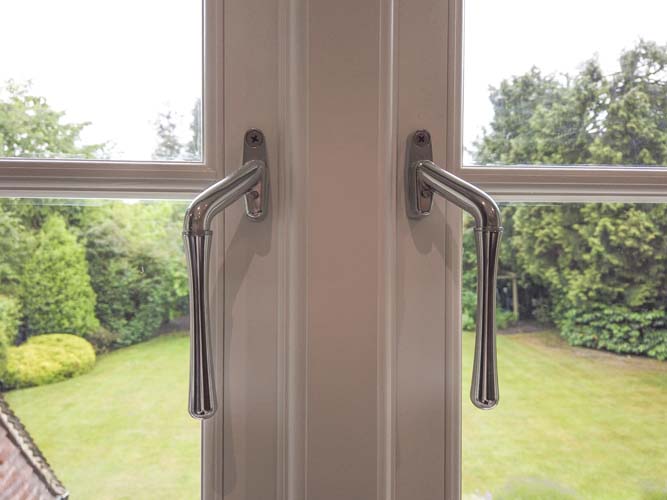 The replacement timber windows in West Byfleet are made from European Redwood Timber and finished with Chrome Ventiss Teardrop handles. The colour of the new windows has made an incredible transformation to this stunning property in West Byfleet; finished in Farrow and Ball Manor House Grey complementing the aluminium doors, already installed to the rear of the property.