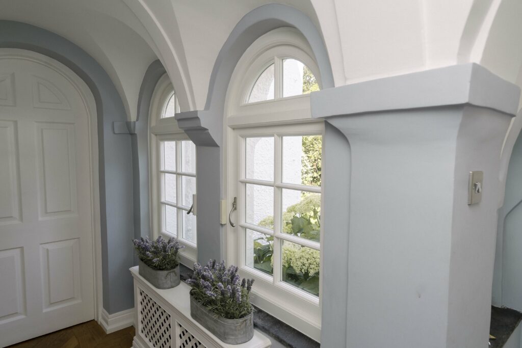 The arched head windows in the hallway and porch add a touch of grandeur and elegance to the room.