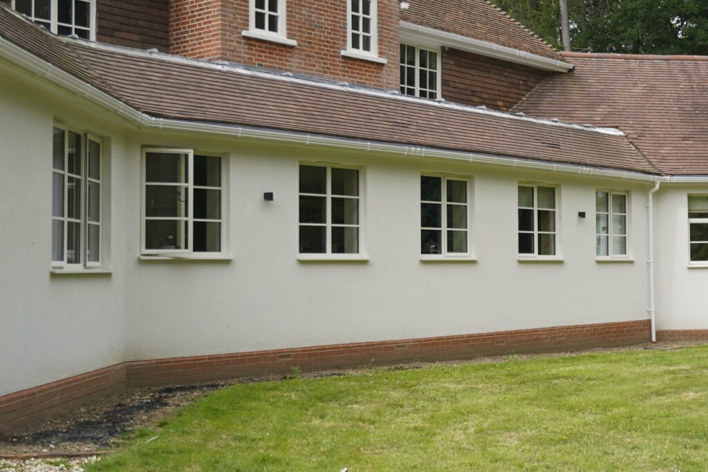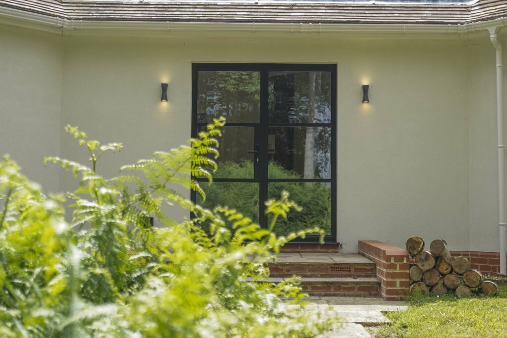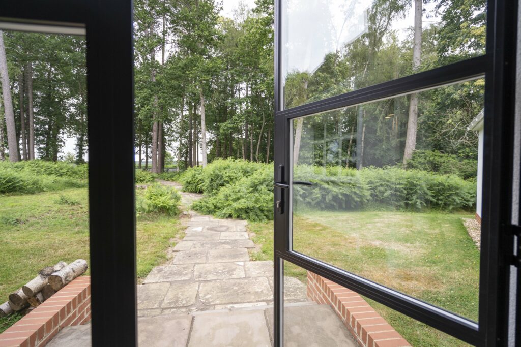 After lengthy discussions and emails with Rob, the homeowners changed their refurbishment plans. They decided to opt for bespoke Heritage 47 aluminium casement windows with 24mm glazing bars finished in traffic white RAL9016 on the outside and inside. For the French aluminium doors, they chose a black finish.