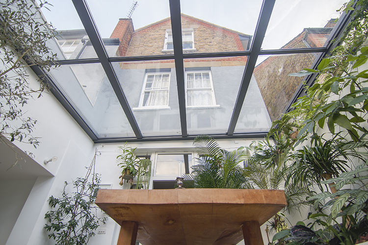 This London Wintergarden houses a kitchen and dining area, with the kitchen being on a lower level. This involved the floor level being dug down and two roofs, each at different levels. Bi-fold doors allow the room to be opened up on warm days.