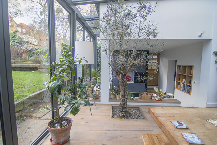 The brief was to create that desired feeling of bringing the outside in. Lots of light and lots of greenery, including an olive tree planted inside.