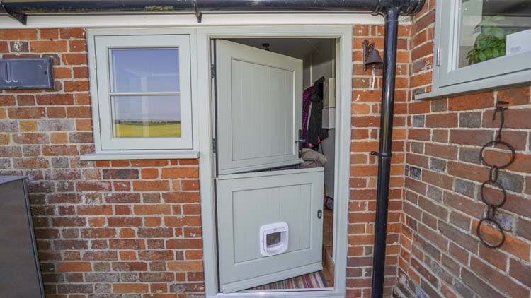 The solid, stable door has been manufactured in European Redwood with shiplap panels for a traditional look. It has been finished in dual colour with French grey on the exterior and white on the interior. It is set within a wooden frame with a side window to allow natural light to flow into the living space. It has been designed with a cat flap so that the family cat can roam more freely.